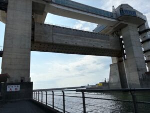 (地上からぐるっと周ると普通に行けるようですが、地震による津波対策の大型水門が展望台となっていて、せっかくなのでこちらのルートで)