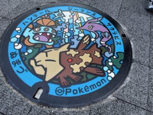 沼津港にそびえる水門(びゅうお)を登り、反対側へ渡ると、深海魚のポケモンがデザインされたマンホール蓋へたどり着きます。